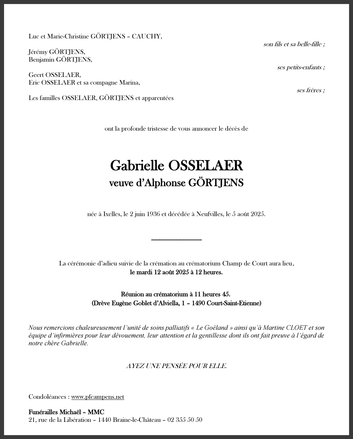 Décédée à Neufvilles (7063) le mardi 5 août 2025 à l'âge de 89 ans