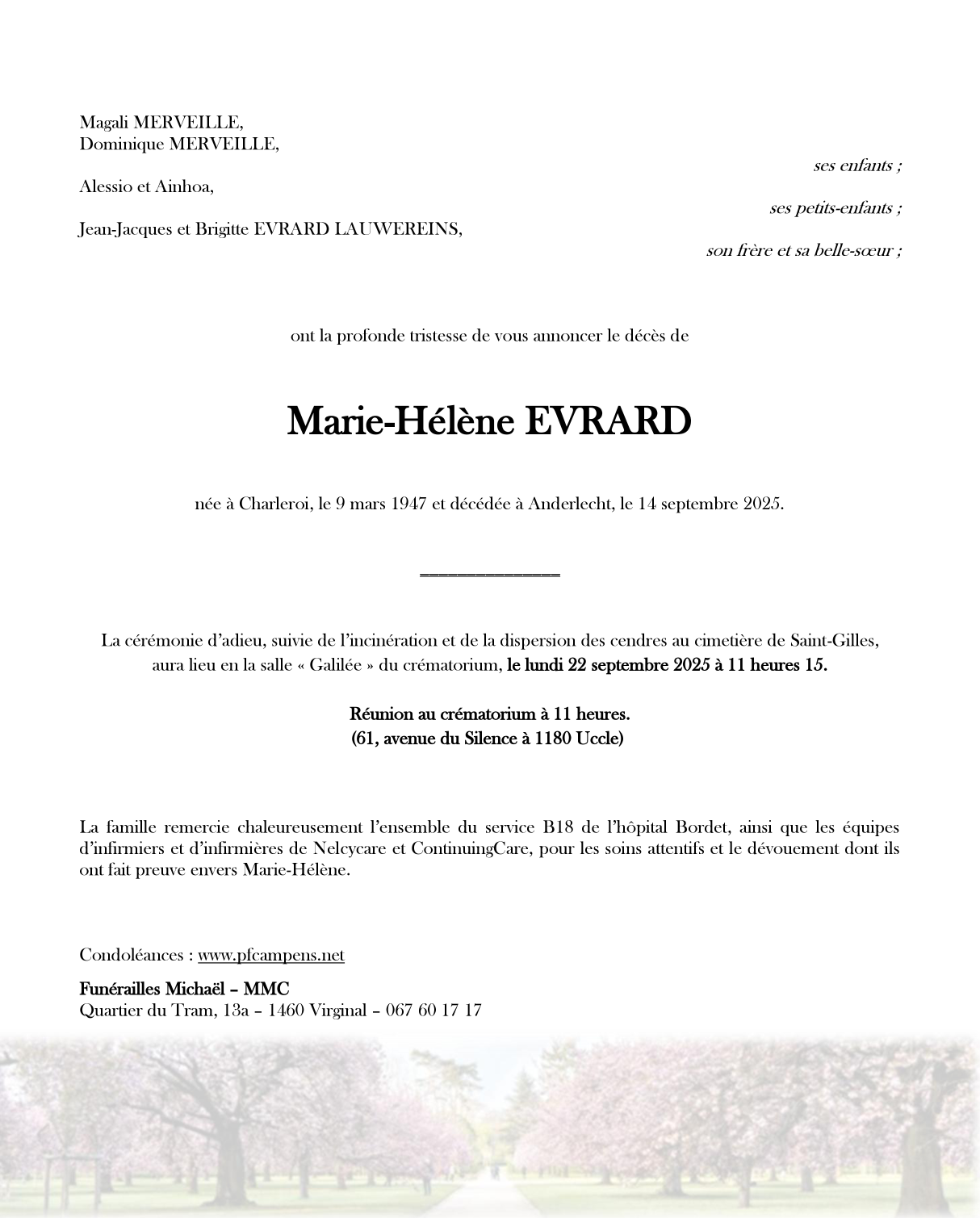 Décédée à Anderlecht (1070) le dimanche 14 septembre 2025 à l'âge de 78 ans