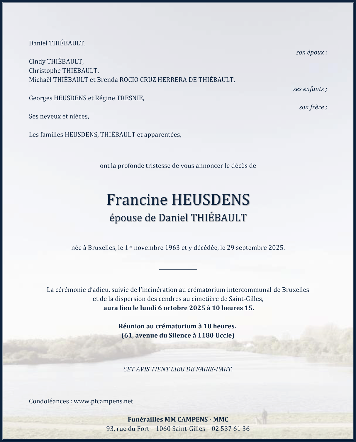 Décédée à Bruxelles (1000) le mardi 30 septembre 2025 à l'âge de 61 ans