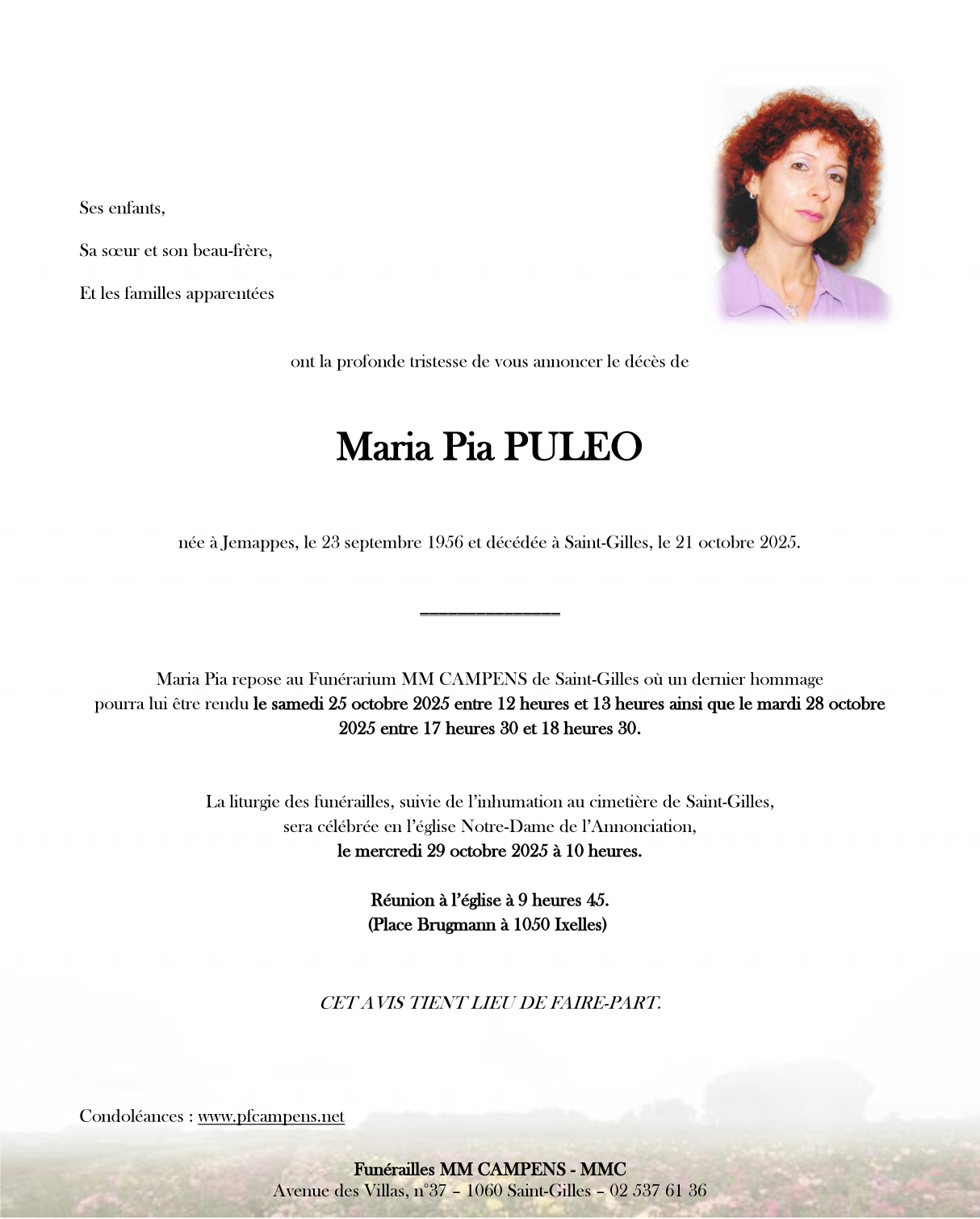 Décédée à Saint-Gilles (1060) le mardi 21 octobre 2025 à l'âge de 69 ans