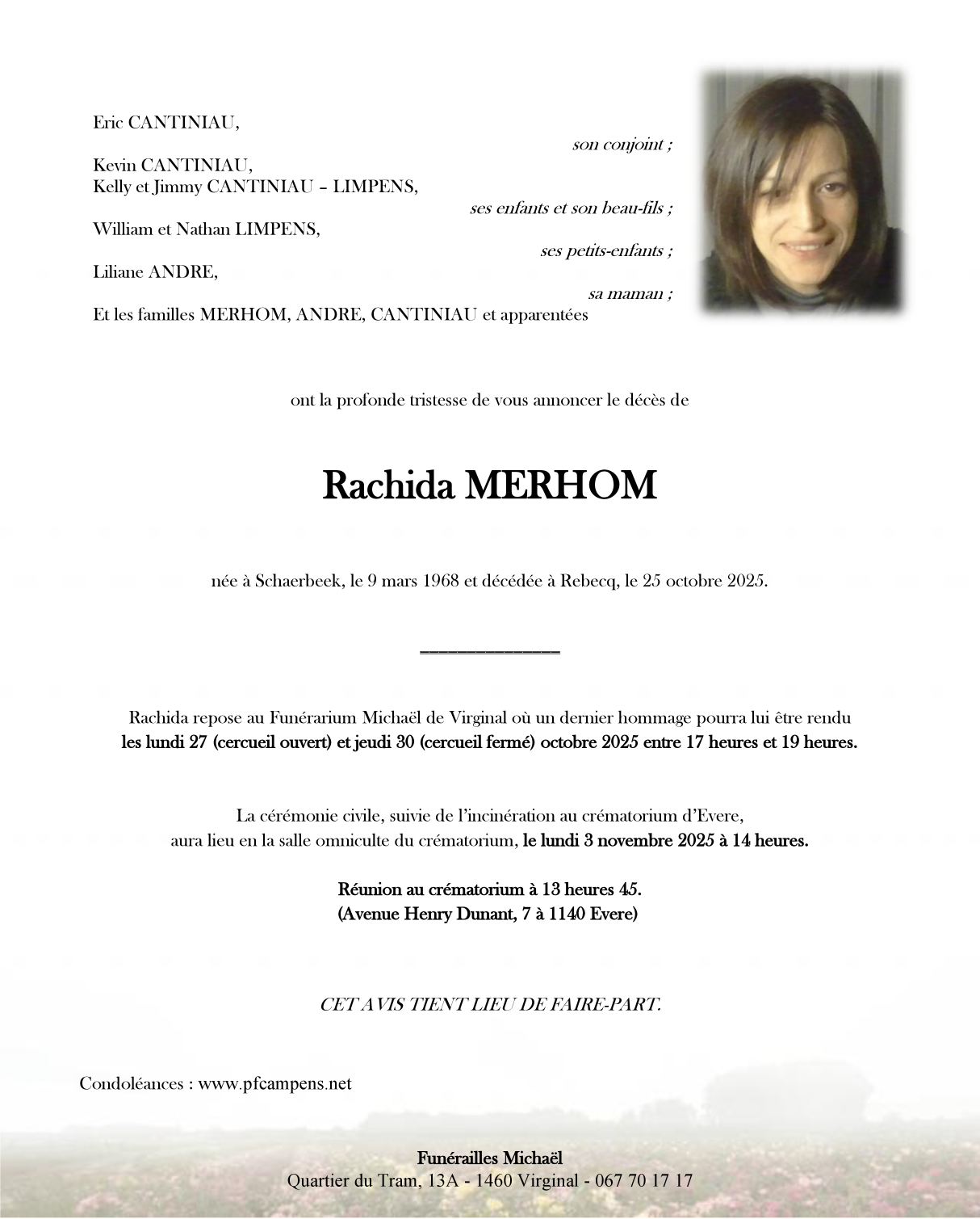 Décédée à Rebecq (1430) le samedi 25 octobre 2025 à l'âge de 57 ans