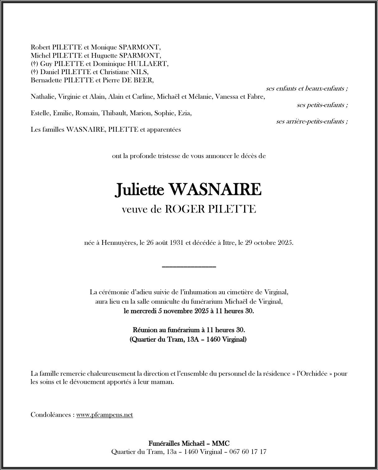 Veuve de Monsieur Roger PILETTE