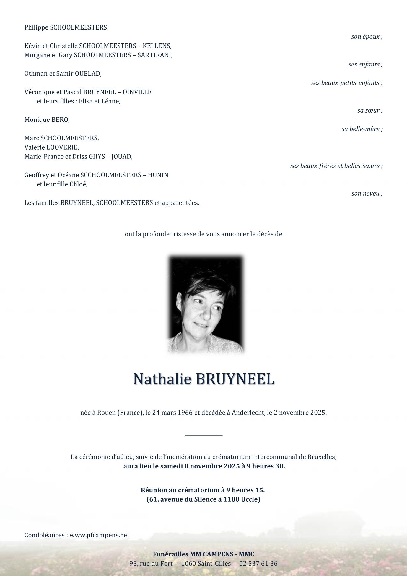 Décédée à Anderlecht (1070) le dimanche 2 novembre 2025 à l'âge de 59 ans