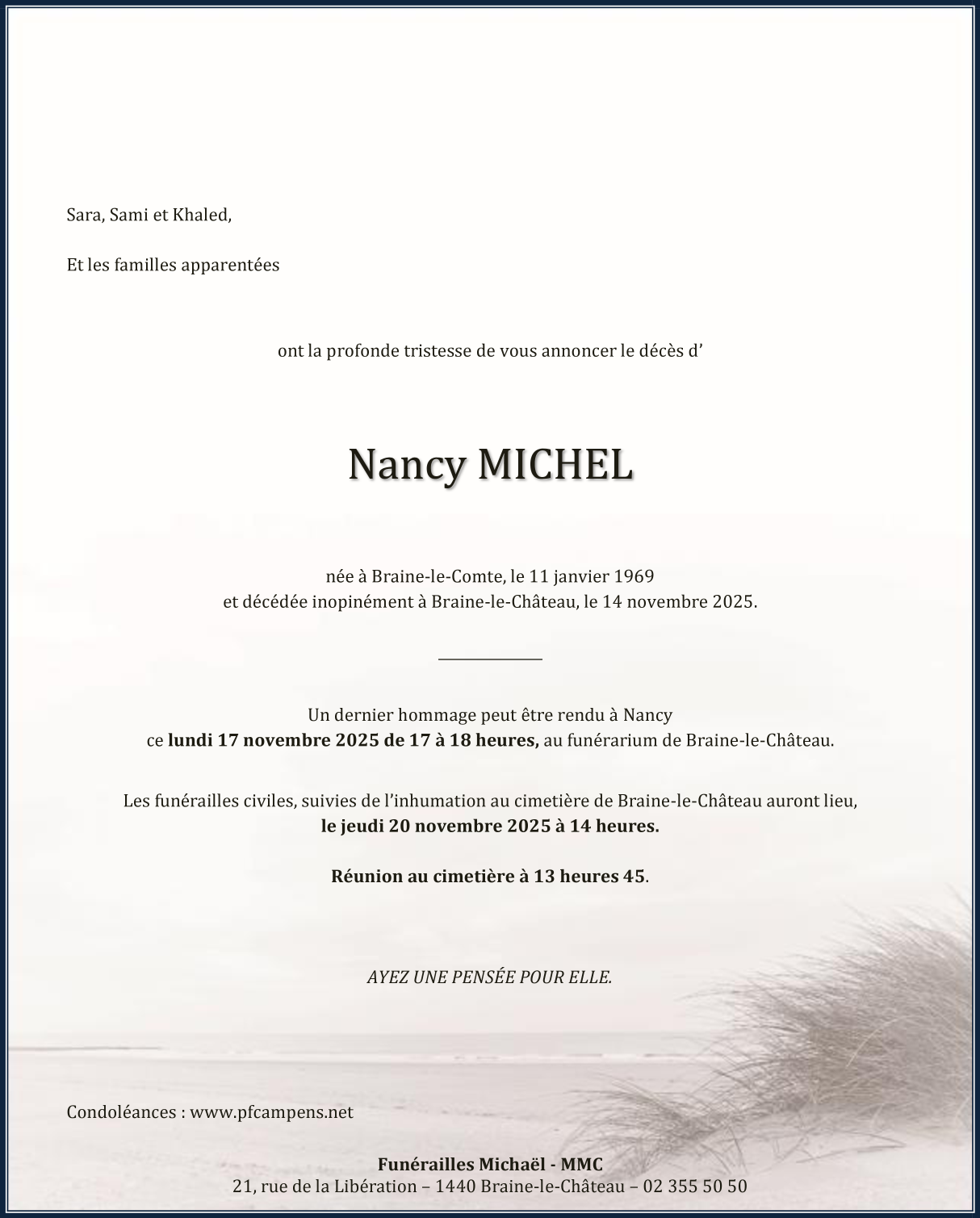 Décédée à Braine-le-Château (1440) le vendredi 14 novembre 2025 à l'âge de 56 ans