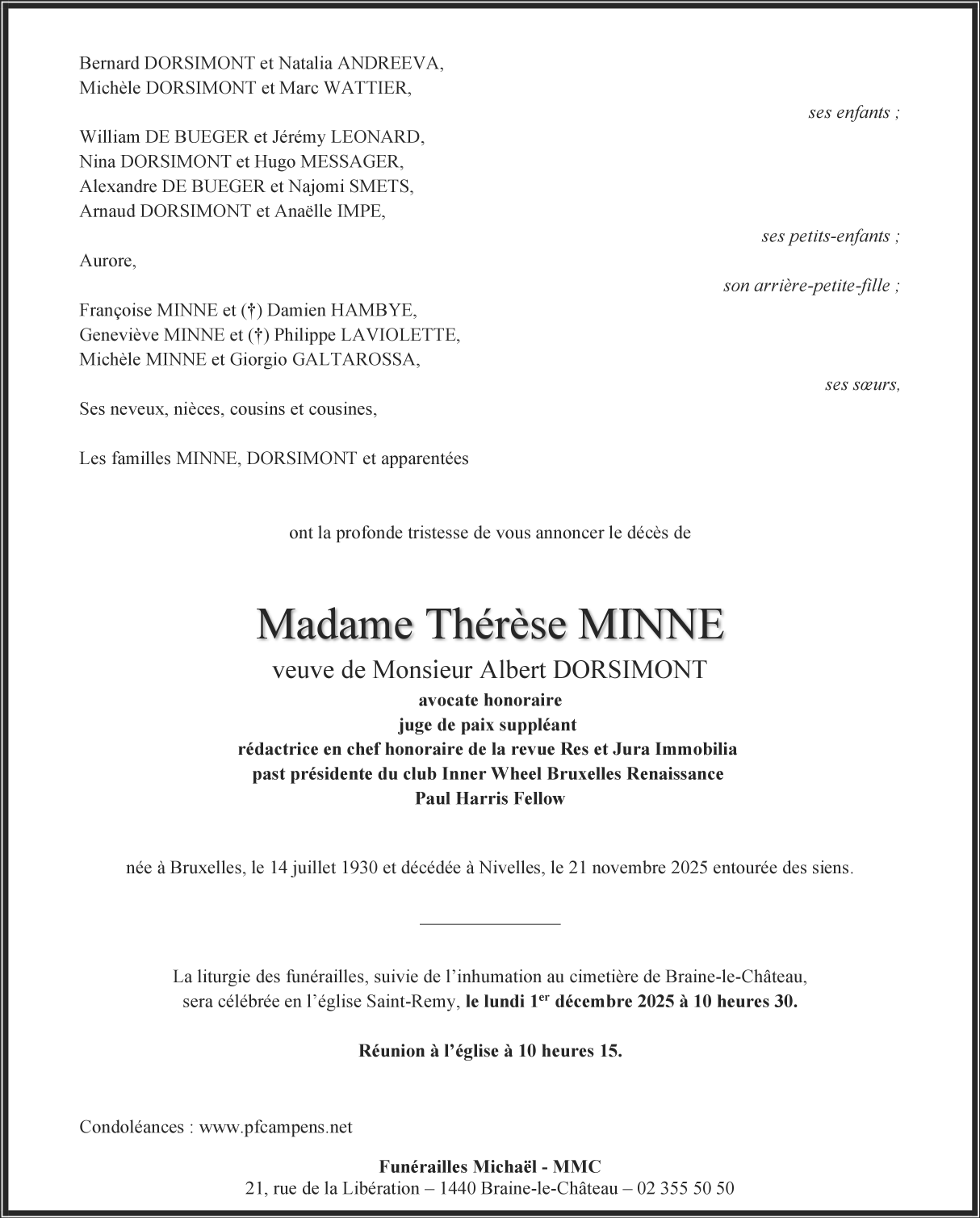 Décédée à Nivelles (1400) le vendredi 21 novembre 2025 à l'âge de 95 ans