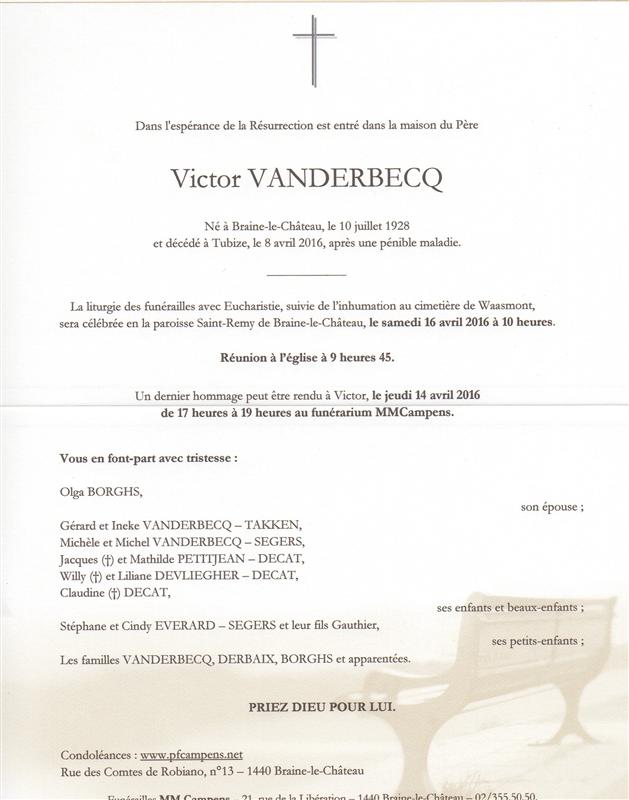 Décédé à Tubize (1480) le samedi 9 avril 2016 à l'âge de 87 ans