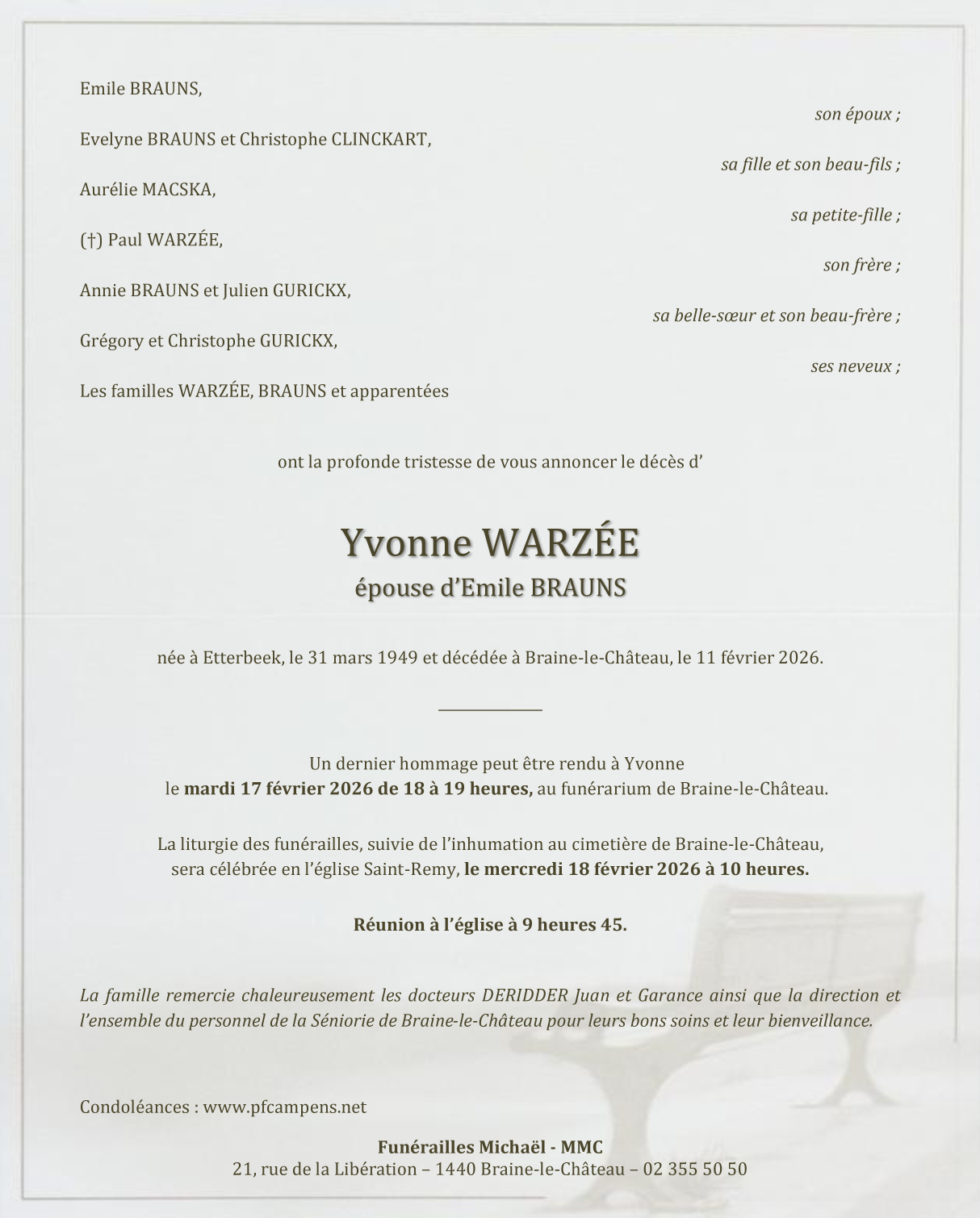 Décédée à Braine-le-Château (1440) le mercredi 11 février 2026 à l'âge de 76 ans
