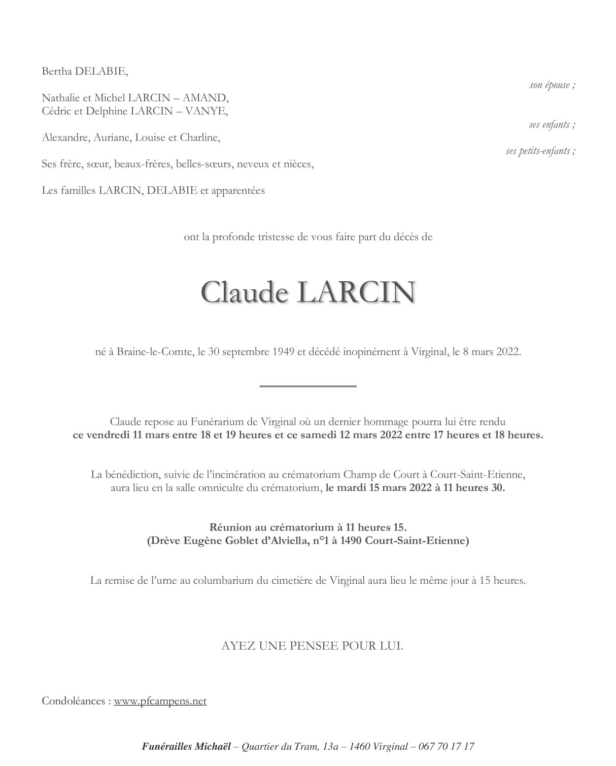 Décédé à Virginal-Samme (1460) le mardi 8 mars 2022 à l'âge de 72 ans