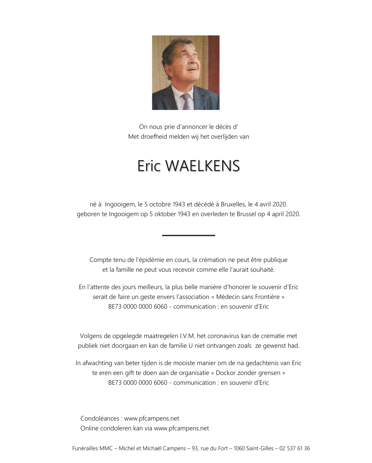 Décédé à Bruxelles (1000) le samedi 4 avril 2020 à l'âge de 76 ans