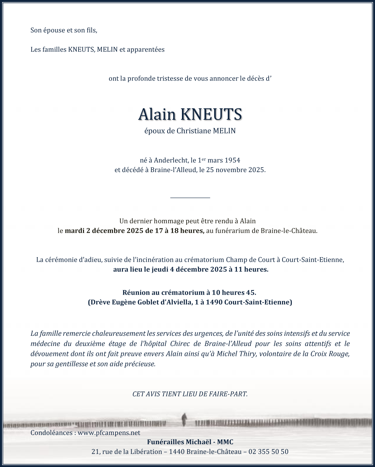 Décédé à Braine-l'Alleud (1420) le mardi 25 novembre 2025 à l'âge de 71 ans