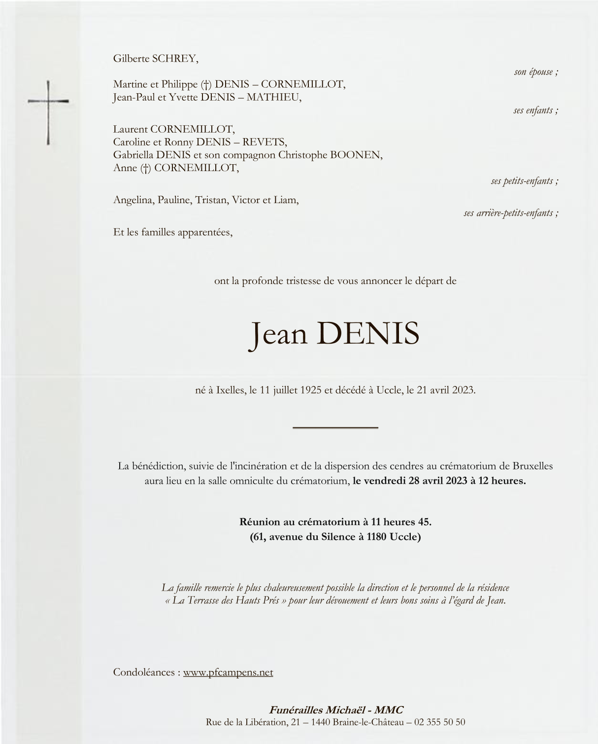 Décédé à Uccle (1180) le vendredi 21 avril 2023 à l'âge de 97 ans
