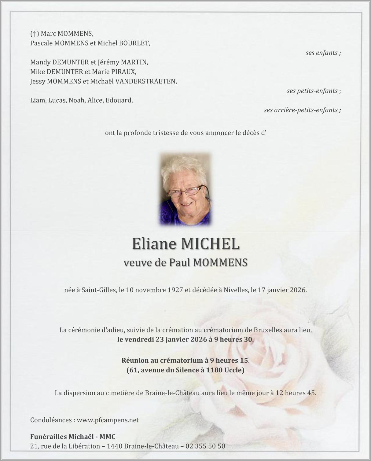 Décédée à Nivelles (1400) le samedi 17 janvier 2026 à l'âge de 98 ans