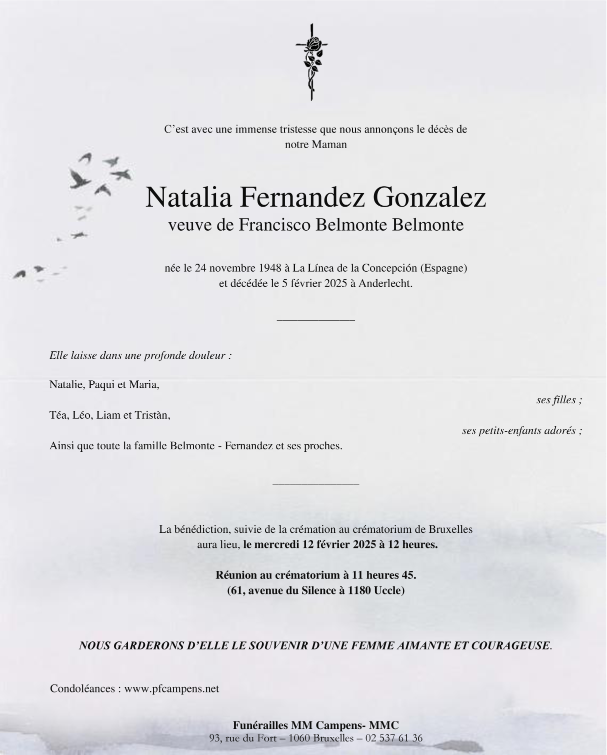 Décédée à Anderlecht (1070) le mercredi 5 février 2025 à l'âge de 76 ans