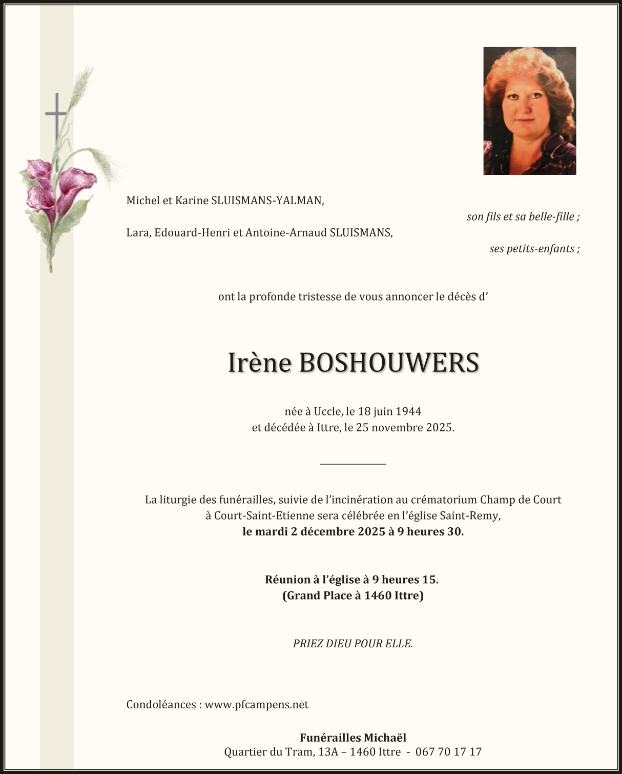 Décédée à Ittre (1460) le mardi 25 novembre 2025 à l'âge de 81 ans