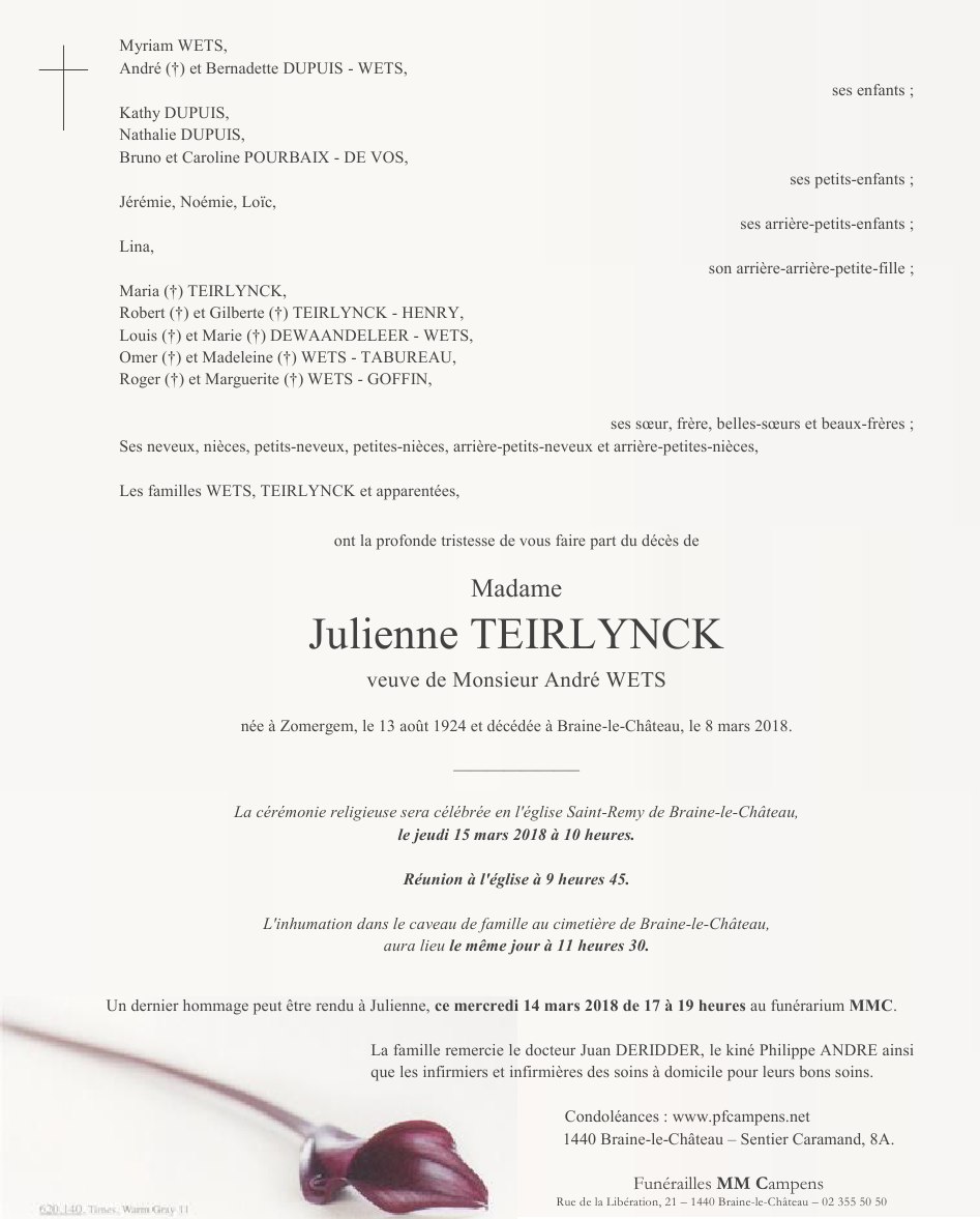 Décédée à Braine-le-Château (1440) le jeudi 8 mars 2018 à l'âge de 93 ans