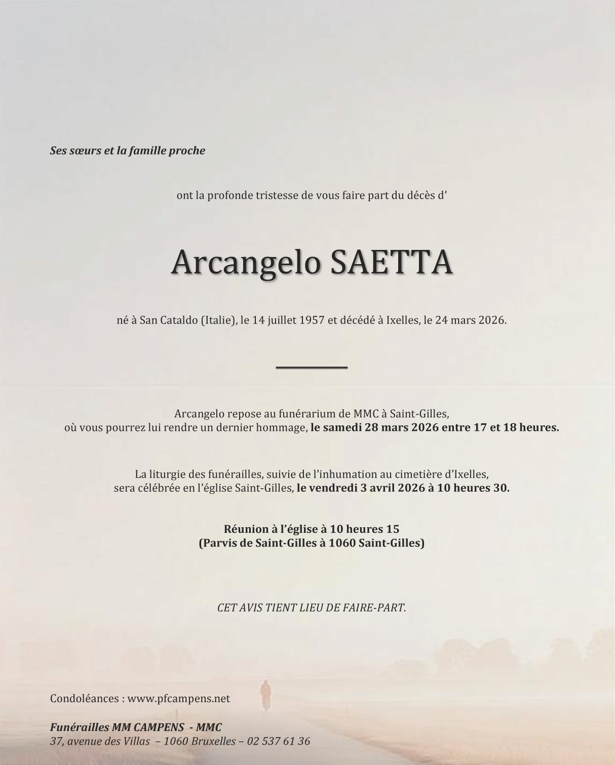 Décédé à Ixelles (1050) le mardi 24 mars 2026 à l'âge de 68 ans