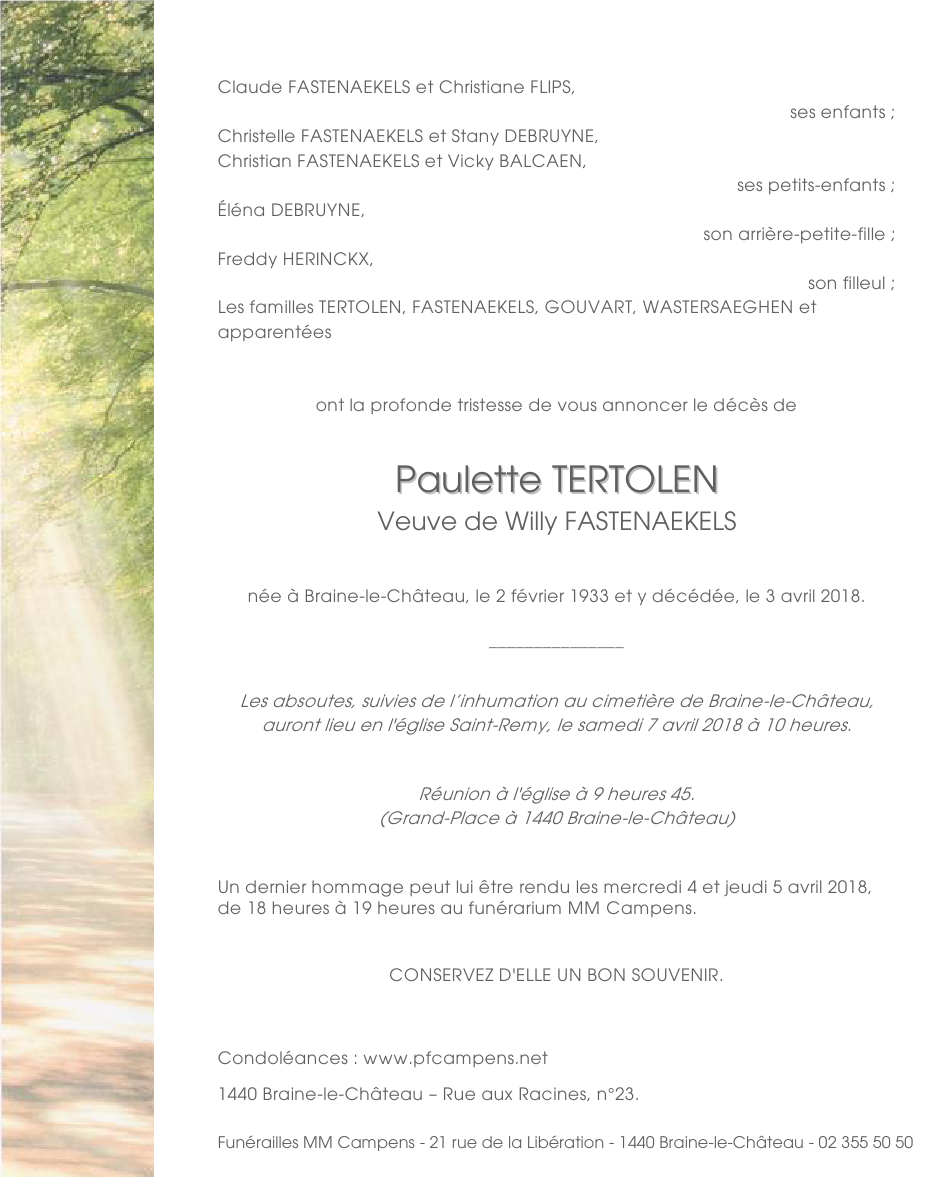 Décédée à Braine-le-Château (1440) le mardi 3 avril 2018 à l'âge de 85 ans