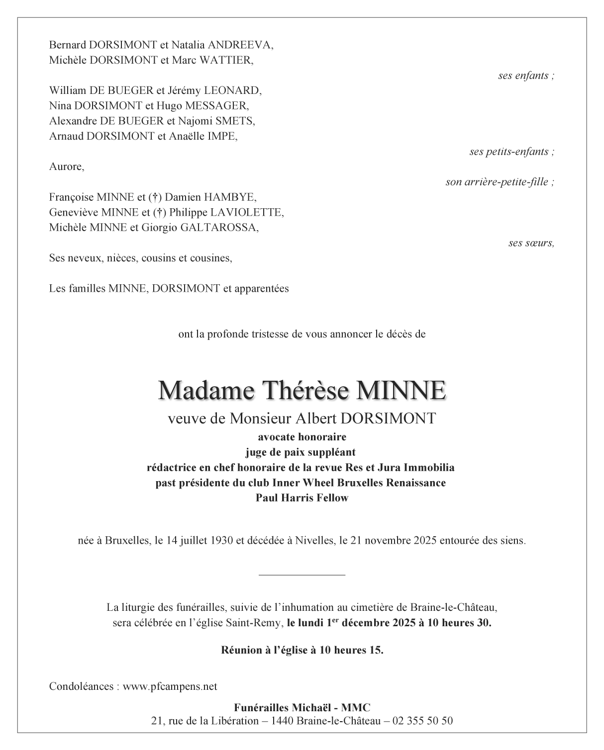 Décédée à Nivelles (1400) le vendredi 21 novembre 2025 à l'âge de 95 ans